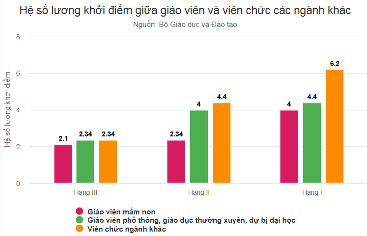 Hai ngày trước, trong góp ý dự thảo Nghị định chính sách tiền lương, chế độ phụ cấp với nhà giáo, Bộ Nội vụ cho rằng đề xuất áp dụng hệ số lương đặc thù 1,25 với giáo viên mầm non, 1,15 với giáo viên phổ thông là không có cơ sở chính trị, pháp lý. Việc này có thể phá vỡ thiết kế hệ thống tiền lương hiện hành trong khi cộng cả phụ cấp thâm niên (5% sau 5 năm công tác, mỗi năm sau tăng 1%) và ưu đãi (25-70%), lương giáo viên đã cao nhất trong các ngành sự nghiệp. Trả lời VnExpress ngày 14/11, ông Vũ Minh Đức, Cục trưởng Nhà giáo và Cán bộ quản lý giáo dục, cho biết Bộ Giáo dục và Đào tạo bảo lưu quan điểm, và sẽ tiếp tục hoàn thiện quy định về hệ số lương đặc thù cho nhà giáo để trình Chính phủ. Cụ thể, ông Đức cho rằng hệ số lương đặc thù với giáo viên là giải pháp chính sách có căn cứ chính trị và pháp lý. Bởi gần 30 năm qua, chủ trương "lương của nhà giáo được ưu tiên xếp cao nhất trong hệ thống thang bậc lương hành chính sự nghiệp" và ngoài lương, nhà giáo "có thêm phụ cấp tùy theo tính chất công việc, theo vùng" luôn được xác định là nhiệm vụ, giải pháp nhất quán trong các Nghị quyết, Kết luận của Đảng và Luật Nhà giáo. Gần nhất, Nghị quyết 71 của Bộ Chính trị hồi tháng 8 cũng nêu "có chính sách ưu đãi đặc thù, vượt trội cho nhà giáo". Bộ Giáo dục và Đào tạo khẳng định lương giáo viên chưa cao nhất như chủ trương nói trên. Phân tích, ông Đức nói quy định lương nhà giáo được xếp cao nhất trong các ngành sự nghiệp là so với "thang bậc lương", chứ không bao gồm các loại phụ cấp như cách tính của Bộ Nội vụ. Trong khi đó, thang lương của giáo viên hiện thấp hơn hầu hết ngành, nghề khác. Chỉ 12% trong số 1,6 triệu nhà giáo được xếp lương theo bậc A1 - A2.1 - A3, tương đương 5,48 đến 18,7 triệu đồng một tháng. Nhưng gần như 100% viên chức ngành y tế, xây dựng, giao thông vận tải, tư pháp, văn hóa - thể thao, khoa học công nghệ, thông tin truyền thông đang ở ba mức này. Tính ở thang lương cao nhất là nhóm A3, chỉ 1,17% giáo viên được hưởng (gần 14.000 người), nhưng những ngành khác đều có khoảng 10%. Đặc biệt, nhóm giáo viên mầm non được xếp vào thang lương thấp nhất, gồm A0 - A1 - A2.2 (tương đương 4,9 - 15,9 triệu đồng mỗi tháng), nhưng phải làm việc trong môi trường nặng nhọc. "Nhìn vào cách xếp lương này, chúng ta chưa thấy nghề giáo là nghề thực sự cao quý, được xã hội tôn vinh", ông Đức nói.