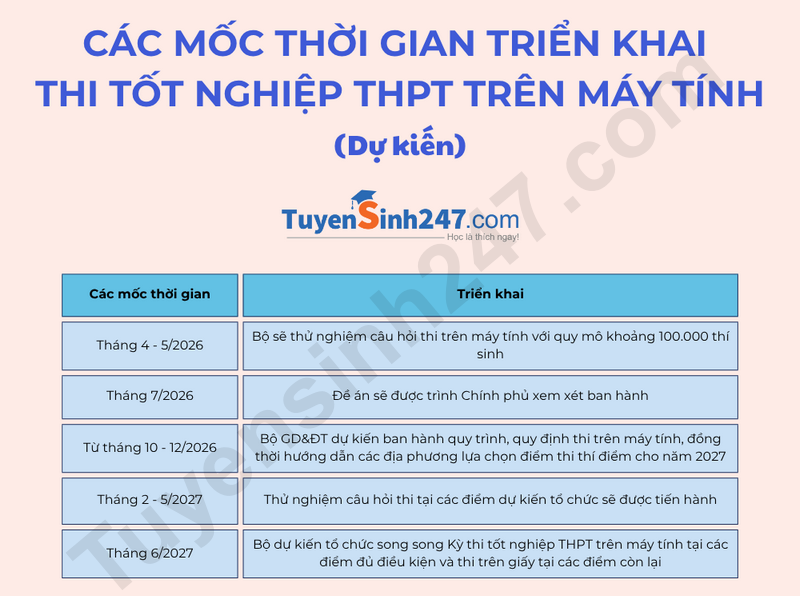 Thông tin từ truyền thông Bộ GD&ĐT, phiên họp có sự tham dự của đại diện Bộ Công an, Ban Cơ yếu Chính phủ, Bộ Khoa học và Công nghệ cùng các cơ sở giáo dục đại học. Trước đó, ngày 29/9, Bộ đã ban hành Quyết định thành lập Ban chỉ đạo xây dựng Đề án tổ chức Kỳ thi tốt nghiệp THPT trên máy tính do Thứ trưởng Phạm Ngọc Thưởng làm trưởng ban. Phiên họp đầu tiên thảo luận về mốc thời gian, lộ trình triển khai, xây dựng ngân hàng câu hỏi, phần mềm thi và hệ thống văn bản pháp lý cho kỳ thi. Nhiều ý kiến cho rằng các trường học cần cho học sinh làm quen với hình thức thi trên máy tính trước khi thay đổi hình thức thi tốt nghiệp THPT. Đồng thời, việc chuẩn bị hạ tầng và quy trình kỹ thuật cho kỳ thi là một trong những nhiệm vụ trọng tâm cần thực hiện trong thời gian tới. Theo kế hoạch, tháng 4-5/2026, Bộ sẽ thử nghiệm câu hỏi thi trên máy tính với quy mô khoảng 100.000 thí sinh, nhằm hoàn thiện ngân hàng câu hỏi và chuẩn bị cho kỳ thi diện rộng. Đến tháng 7/2026, Đề án sẽ được trình Chính phủ xem xét ban hành. Từ tháng 10 đến 12/2026, Bộ GD&ĐT dự kiến ban hành quy trình, quy định thi trên máy tính, đồng thời hướng dẫn các địa phương lựa chọn điểm thi thí điểm cho năm 2027. Giai đoạn tháng 2-5/2027, việc thử nghiệm câu hỏi thi tại các điểm dự kiến tổ chức sẽ được tiến hành. Đến tháng 6/2027, Bộ dự kiến tổ chức song song Kỳ thi tốt nghiệp THPT trên máy tính tại các điểm đủ điều kiện và thi trên giấy tại các điểm còn lại, đánh dấu bước chuyển quan trọng trong tiến trình hiện đại hóa công tác thi cử quốc gia. Theo Báo Dân Trí 🔥 2K8 CHÚ Ý! LUYỆN THI TN THPT - ĐÁNH GIÁ NĂNG LỰC - ĐÁNH GIÁ TƯ DUY!