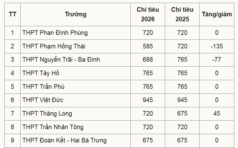 Con số này có thể tăng nhẹ vì một số trường dự kiến hoạt động từ năm tới chưa được giao chỉ tiêu, gồm THPT Hoàng Quán Chi (phường Yên Hòa), Vĩnh Hưng (phường Vĩnh Hưng), Việt Hùng (xã Đông Anh).