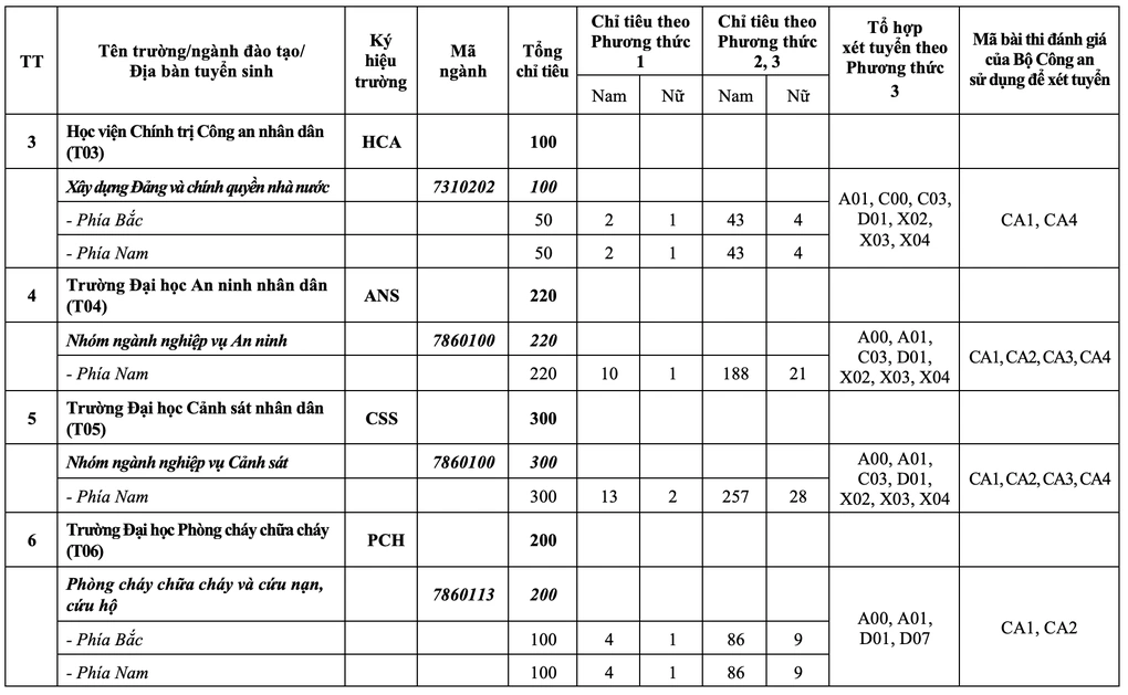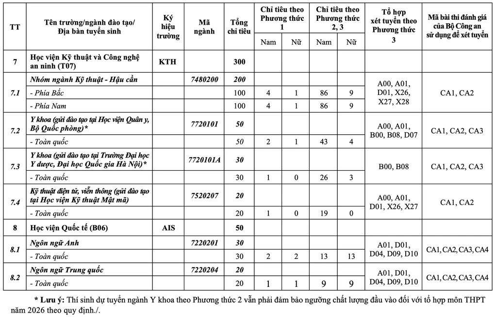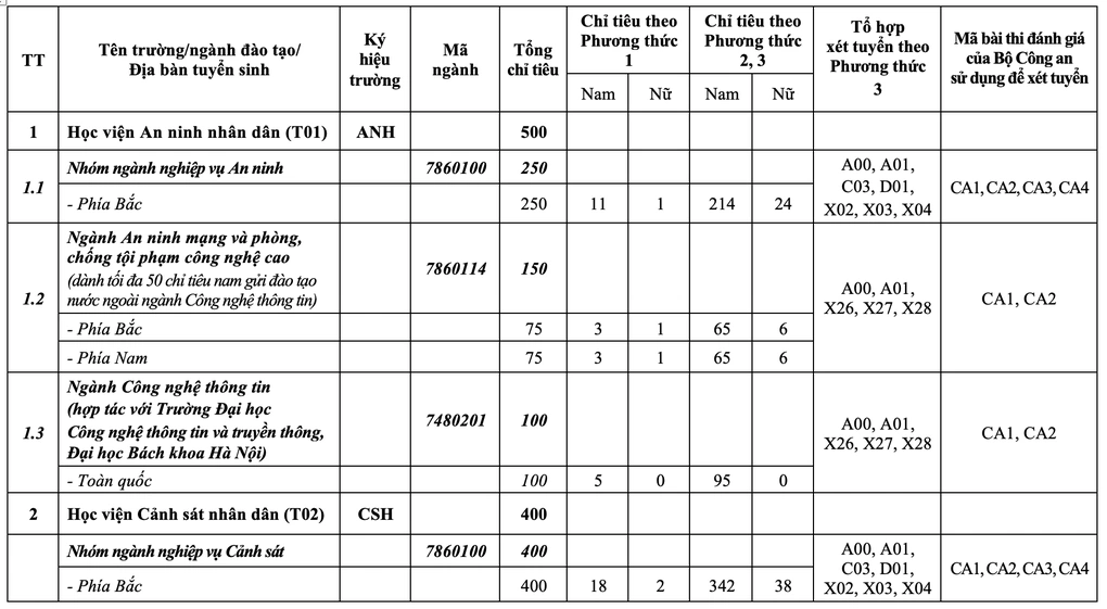 Theo đó, tổng chỉ tiêu vào 8 trường, học viện Công an nhân dân năm 2026 là 2.070, giảm 280 chỉ tiêu so với năm 2025. Trong đó, Học viện An ninh nhân dân lấy nhiều nhất với 500 chỉ tiêu, bao gồm 100 chỉ tiêu hợp tác đào tạo với Đại học Bách khoa Hà Nội. Học viện Quốc tế lấy ít nhất với 50 chỉ tiêu trên toàn quốc, trong đó ngành Ngôn ngữ Anh lấy 30 chỉ tiêu, ngành Ngôn ngữ Trung lấy 20 chỉ tiêu. Chi tiết chỉ tiêu và tổ hợp xét tuyển vào 8 trường, học viên Công an nhân dân năm 2026 như sau: