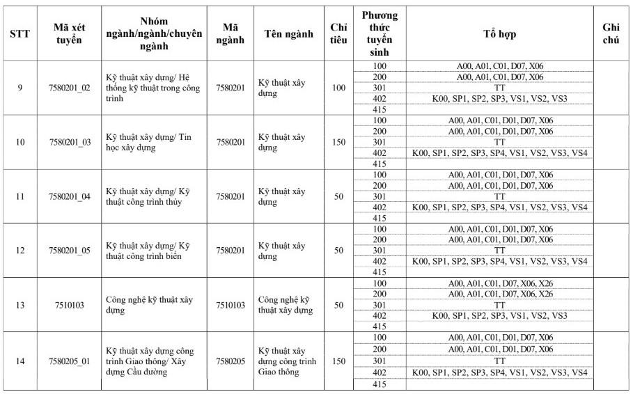I. Phương thức tuyển sinh1. Phương thức 1: Xét tuyển sử dụng kết quả của Kỳ thi tốt nghiệp THPT năm 2025 và kết quả thi các môn năng khiếu năm 2025 (với các ngành/chuyên ngành có xét tuyển các môn năng khiếu). - Thí sinh đăng ký nguyện vọng xét tuyển trên Hệ thống hỗ trợ tuyển sinh chung của Bộ GDĐT (Hệ thống) (dự kiến từ ngày 16/7 đến 17 giờ 00 ngày 28/7/2025). - Thí sinh sử dụng chứng chỉ ngoại ngữ quốc tế để quy đổi thay thế điểm môn Tiếng Anh/Tiếng Pháp trong tổ hợp xét tuyển cần đăng ký trực tuyến qua Cổng Thông tin điện tử: https://qdcc.huce.edu.vn từ ngày 15/5 đến ngày 10/6/2025. 2. Phương thức 2: Xét kết quả học tập cấp THPT (học bạ) (áp dụng chung cho cả thí sinh tốt nghiệp THPT năm 2025 và thí sinh đã tốt nghiệp THPT trước năm 2025). Thí sinh đăng ký trực tuyến trên 2 Hệ thống: - Bước 1: Đăng ký trên hệ thống của Trường tại https://xthb.huce.edu.vn từ ngày 15/5/2025 đến 24 giờ 00 ngày 10/6/2025. - Bước 2: Đăng ký nguyện vọng xét tuyển trực tuyến trên Hệ thống (dự kiến từ ngày 16/7 đến 17 giờ 00 ngày 28/7/2025). 3. Phương thức 3: Xét kết quả các Kỳ thi do các cơ sở giáo dục đại học khác tổ chức (TSA, SPT, V-SAT): Thí sinh đăng ký nguyện vọng xét tuyển trực tuyến trên Hệ thống (dự kiến từ ngày 16/7 đến 17 giờ 00 ngày 28/7/2025). 4. Phương thức 4: Xét sử dụng chứng chỉ đánh giá năng lực quốc tế Thí sinh đăng ký theo các bước sau: Bước 1: Điền mẫu phiếu đăng ký xét tuyển theo mẫu: tải TẠI ĐÂY Bước 2: Hoàn thiện hồ sơ theo quy định trong file Thông tin tuyển sinh đính kèm phía dưới Bước 3: Nộp hồ sơ trực tiếp tại Trường (trong giờ hành chính) hoặc gửi qua đường bưu điện bằng chuyển phát nhanh từ ngày 15/5/2025 đến 17 giờ 00 ngày 10/6/2025; Địa chỉ nhận hồ sơ: Bộ phận tuyển sinh đại học, Phòng Truyền thông và Tuyển sinh, Trường Đại học Xây dựng Hà Nội P.304 nhà A1, số 55 Đường Giải Phóng, Phường Đồng Tâm, Quận Hai Bà Trưng, Hà Nội Điện thoại: (024)38 694 711; Hotline: 0869 071 382 - Bước 4: Đăng ký trực tuyến trên Hệ thống (dự kiến ngày 16/7 đến 17 giờ 00 ngày 28/7/2025). 5. Phương thức 5: Tuyển thẳng và Ưu tiên xét tuyển 5.1. Tuyển thẳng Trường sẽ thông báo sau khi có Kế hoạch của Bộ GDĐT. 5.2. Ưu tiên xét tuyển: Đối tượng: Thí sinh có thành tích đặc biệt hoặc thí sinh là học sinh hệ chuyên (3 năm học lớp 10, 11, 12) của các trường THPT chuyên toàn quốc, các trường THPT trọng điểm quốc gia. - Bước 1: Đăng ký trên hệ thống của Trường: https://utxt.huce.edu.vn từ ngày 15/5/2025 đến 24 giờ 00 ngày 10/6/2025. - Bước 2: Đăng ký nguyện vọng xét tuyển trực tuyến trên Hệ thống (dự kiến từ ngày 16/7 đến 17 giờ 00 ngày 28/7/2025). II. Lệ phí đăng ký:1. Đăng ký trên Cổng thông tin điện tử của Trường: 50.000 đồng/1 hồ sơ/1 hình thức đăng ký. Thí sinh nộp qua hình thức chuyển khoản đến địa chỉ: - Tên chủ tài khoản: Trường Đại học Xây dựng Hà Nội - Số tài khoản: 111000094184 tại ngân hàng Vietinbank chi nhánh Hai Bà Trưng - Nội dung chuyển tiền: Thí sinh cần ghi rõ nội dung chuyển tiền theo cú pháp: - Đối với đăng ký xét tuyển theo kết quả học tập cấp THPT (học bạ): Nguyễn Văn Anh 012345678912 LP XTHB 2025 - Đối với phương thức xét tuyển chứng chỉ đánh giá năng lực quốc tế: Nguyễn Văn Anh 012345678912 LP CCQT 2025 - Đối với đăng ký quy đổi chứng chỉ ngoại ngữ quốc tế: Nguyễn Văn Anh 012345678912 LP QDCC 2025 - Đối với đăng ký ưu tiên xét tuyển: Nguyễn Văn Anh 012345678912 LP UTXT 2025 2. Đăng ký trên Hệ thống của Bộ GDĐT: Thí sinh nộp lệ phí theo quy định và hướng dẫn của Bộ GDĐT. Lưu ý: - Thông tin thí sinh đăng ký trên các Cổng thông tin điện tử của Trường dùng để làm dữ liệu phục vụ xét tuyển, quy đổi điểm chứng chỉ ngoại ngữ và xét cộng điểm ưu tiên. Công tác xét tuyển của Nhà trường thực hiện theo Kế hoạch của Bộ GDĐT. - Thí sinh tự do (đã tốt nghiệp THPT, trung cấp trước năm 2025) chưa có tài khoản ĐKXT trên Hệ thống cần hoàn thiện việc xin cấp tài khoản ĐKXT với các Sở GDĐT (dự kiến từ ngày 10/7 đến ngày 20/7/2025) để có thể đăng ký nguyện vọng xét tuyển trên Hệ thống; >> Đề án chi tiết năm 2025 của trường Đại học Xây dựng Hà Nội sẽ được cập nhật chi tiết TẠI ĐÂY >>Xem điểm chuẩn các năm của trường Đại học Xây dựng Hà Nội TẠI ĐÂY III. Ngành tuyển sinh