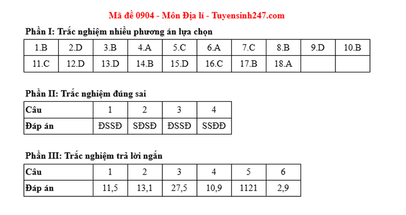 Đáp án đề thi môn Địa mã đề 0904 - tốt nghiệp THPT 2025