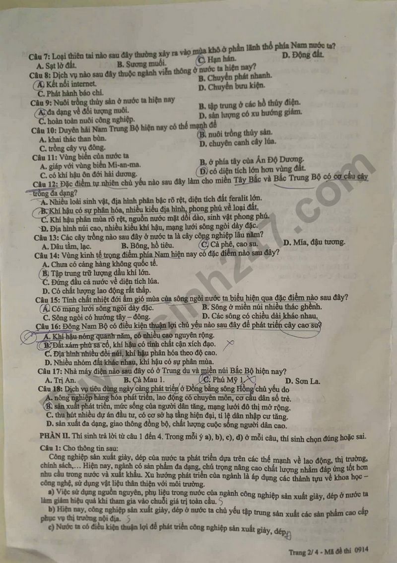 Đáp án đề thi môn Địa tốt nghiệp THPT 2025 - mã đề 0914