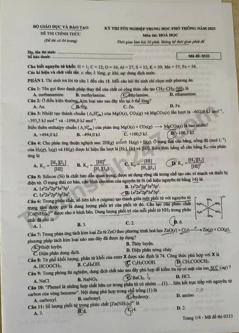Đề thi môn Hóa mã đề 0333 tốt nghiệp THPT 2025