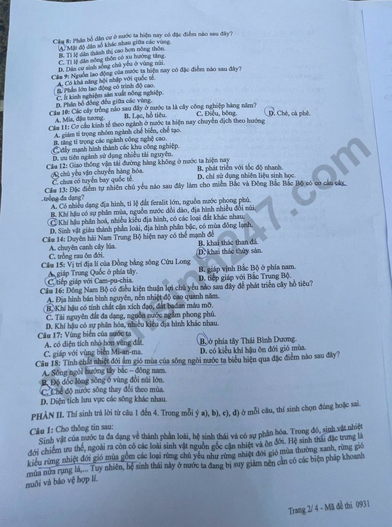 Đáp án đề thi tốt nghiệp THPT 2025 mã đề 0931 môn Địa