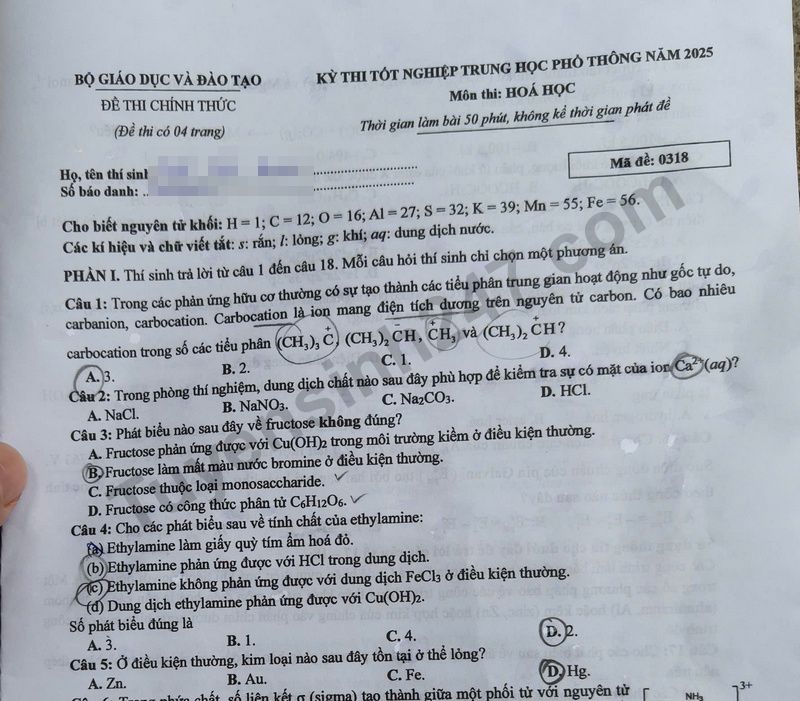 Đáp án đề thi tốt nghiệp THPT năm 2025 - môn Hóa mã đề 0318