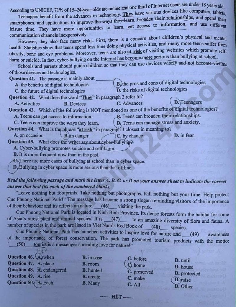 Đề thi vào lớp 10 môn Anh 2025 - Bắc Ninh Question 41. The passage is mainly about A. the benefits of digital technologies C. the future of digital technologies B. the pros and cons of digital technologies D. the risks of digital technologies Lưu ý: Đáp án trong đề thi là của học sinh, có thể không chính xác