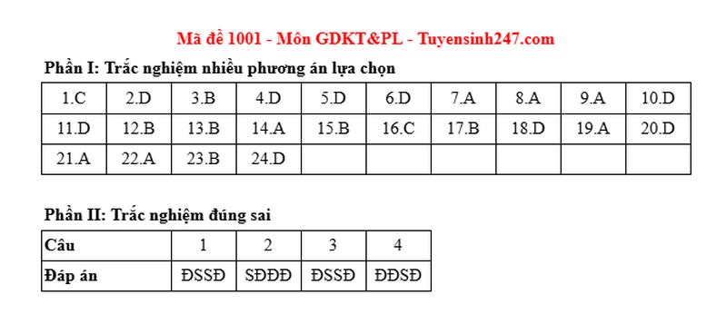Đáp án đề thi tốt nghiệp THPT năm 2025 môn GDKTPL - mã đề 1001