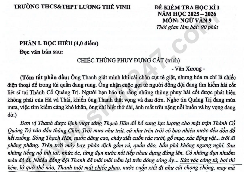 Đề cuối học kì 1 môn Văn lớp 9 năm 2025 - Lương Thế Vinh Câu 3 (1,0 điểm). Các câu văn “Trên trời máy bay, pháo địch gầm rú, quần đảo, bắn phá không ngưng nghỉ. Sau những tiếng nổ inh tai, nhức óc, từng đụn nước nối tiếp nhau dựng đứng lên.” giúp em hiểu gì về những nguy hiểm mà những người lính trẻ phải đối mặt? Câu 4 (1,0 điểm). Xác định lời dẫn trực tiếp có trong các câu văn sau và chuyển lời dẫn đó sang lời dẫn gián tiếp: Thanh cựa mình định ngồi dậy, nhưng toàn thân ê ẩm, đau buốt không sao nhấc lên được. Một người đàn ông mặc áo bờ lu trắng đến gần bảo: “Anh bị mất máu khá nhiều nhưng rất may là đồng đội của anh đã kịp thắt ga rô”. Câu 5 (1,0 điểm). Qua nội dung câu chuyện, nhà văn muốn gửi tới người đọc những thông điệp gì?