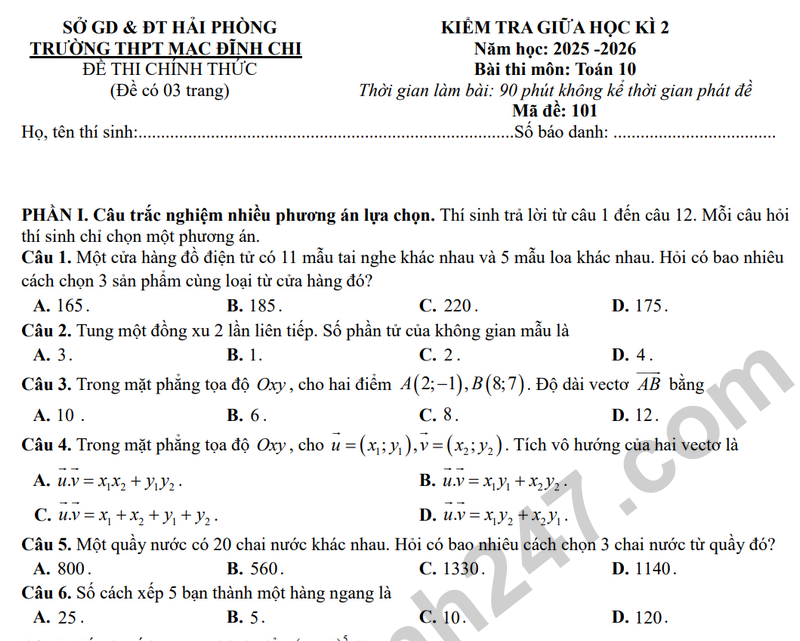 Đề giữa học kì 2 Toán 10 trường THPT Mạc Đĩnh Chi – Hải Phòng 2026 - Mã đề 101