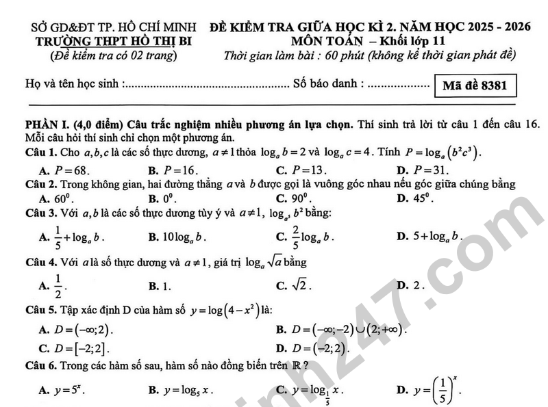 Đề giữa học kì 2 Toán 11 trường THPT Hồ Thị Bi năm 2026 Câu 1: Tại một xí nghiệp, công thức P(t) = 400.(1/2)^t/3 được dùng để tính giá trị còn lại (tính theo triệu đồng) của một chiếc máy sau thời gian t (tính theo năm) kể từ khi đưa vào sử dụng. a) Giá trị ban đầu của chiếc máy là 400 triệu đồng. b) Giá trị còn lại của chiếc máy giảm 2 lần sau 3 năm sử dụng. c) Sau 2 năm đưa vào sử dụng thì giá trị của chiếc máy giảm khoảng 37% so với giá trị ban đầu của nó. d) Giá trị còn lại của máy sau 3 năm sử dụng là 50 triệu đồng.