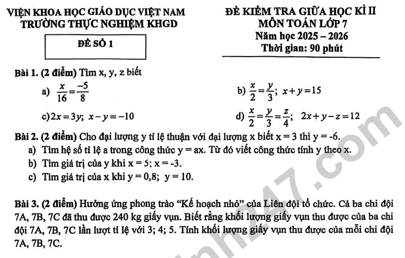 Đề giữa học kì 2 Toán 7 trường Thực Nghiệm KHGD năm 2026 Bài 3. (2 điễm) Hưởng ứng phong trào “Kế hoạch nhỏ” của Liên đội tổ chức. Cả ba chi đội 7A, 7B, 7C đã thu được 240 kg giấy vụn. Biết rằng khối lượng giấy vụn thu được của ba chỉ đội 7A, 7B, 7C lần lượt tỉ lệ với 3; 4; 5. Tính khối lượng giấy vụn thu được của mỗi chi đội 7A, 7B, 7С.