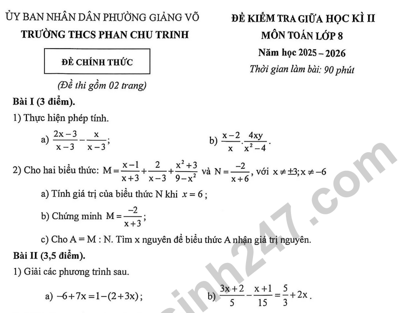 Đề giữa học kì 2 Toán 8 trường THCS Phan Chu Trinh năm 2026 Bài II (3,5 điểm). 2) Giải bài toán bằng cách lập phương trình. Một xe du lịch đi từ thành phố A đến thành phố B với vận tốc trung bình 70 km/h, sau khi tham quan 2 tiếng rưỡi tại B, xe du lịch trở về điểm xuất phát với vận tốc trung bình 80 km/h. Tổng thời gian đi, thời gian tham quan và thời gian về là 17 giờ 30 phút. Tính quãng đường giữa thành phố A và thành phố B.