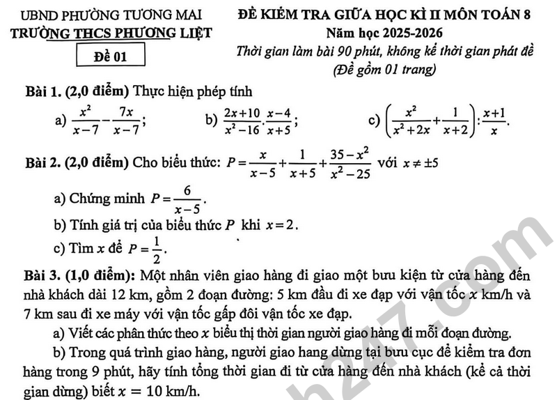 Đề giữa học kì 2 Toán 8 trường THCS Phương Liệt năm 2026 Bài 3. (1,0 điểm): Một nhân viên giao hàng đi giao một bưu kiện từ cửa hàng đến nhà khách dài 12 km, gồm 2 đoạn đường: 5 km đầu đi xe đạp với vận tốc x km/h và 7 km sau đi xe máy với vận tốc gấp đôi vận tốc xe đạp. a) Viết các phân thức theo x biểu thị thời gian người giao hàng đi mỗi đoạn đường. b) Trong quá trình giao hàng, người giao hang dừng tại bưu cục để kiểm tra đơn hàng trong 9 phút, hãy tính tổng thời gian đi từ cửa hàng đến nhà khách (kể cả thời gian dừng) biết x = 10 km/h.
