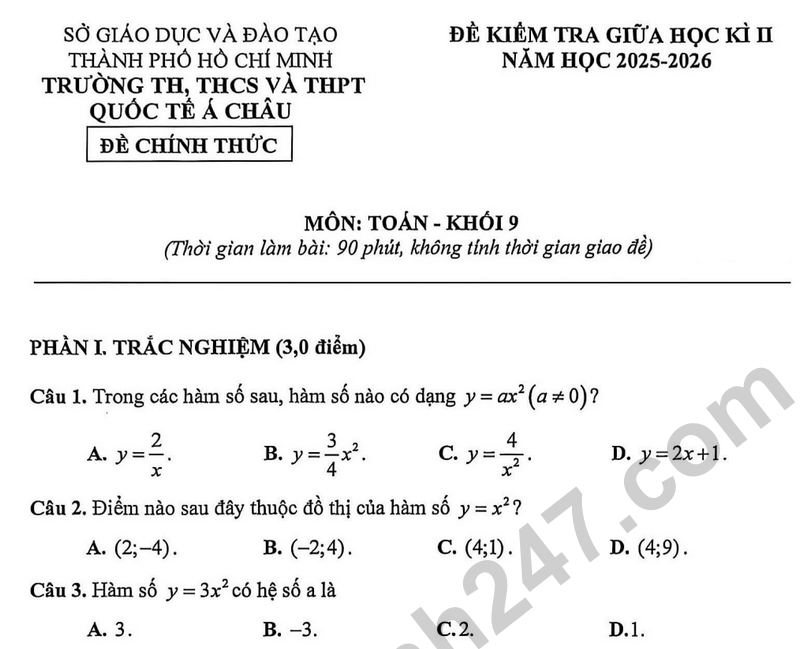 Đề giữa học kì 2 Toán 9 trường Quốc tế Á Châu – TP HCM năm 2026 Câu 3. (1,0 điểm) Một mảnh vườn hình chữ nhật có chu vi là 46m và độ dài đường chéo bằng 17m. Tính diện tích của mảnh vườn.