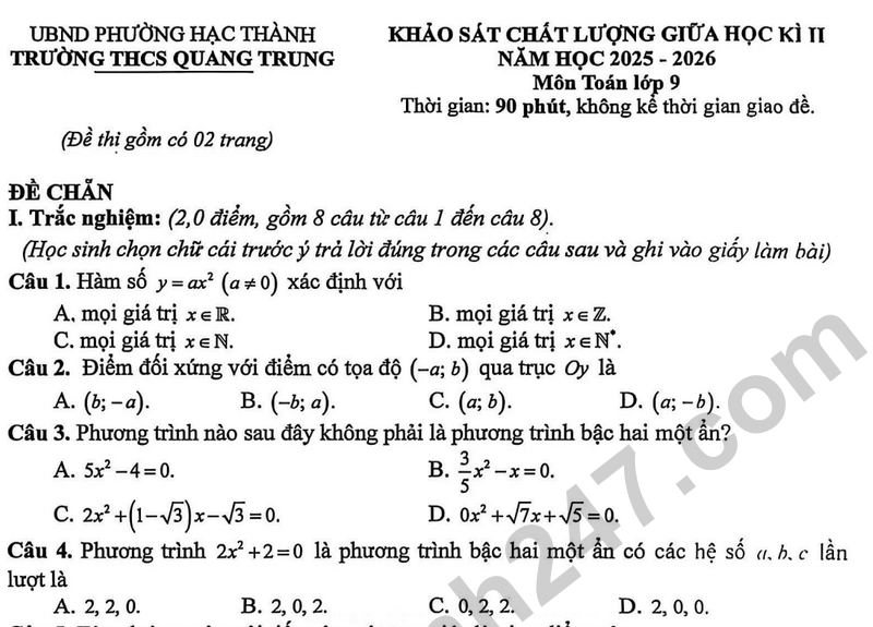 Đề giữa học kì 2 Toán 9 trường THCS Quang Trung năm 2026 Câu 12. (1,5 điểm) Quãng đường AB dài 270 km, hai ô tô khởi hành cùng một lúc đi từ A đến B, ô tô thứ nhất chạy nhanh hơn ô tô thứ hai 12 km/h nên đến B trước ô tô thứ hai 45 phút. Tính vận tốc của mỗi xe.
