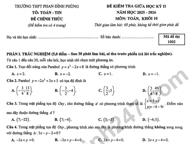 Đề giữa học kỳ 2 Toán 10 THPT Phan Đình Phùng năm 2026 Câu 4. (1 điểm) Một trạm chiết dầu đặt tại vị trí A ở đảo, cách bờ biển một khoảng AH=3km (H nằm trên bờ biển và coi bờ biển là 1 đường thẳng). Kho lưu trữ trung tâm nằm tại vị trí B trên bờ biển và BH =10 km. Để chuyển dầu từ A về B, người ta lắp đặt đường ống dẫn dầu dưới biển đến điểm M trên bờ biển, sau đó dẫn tiếp bằng đường ống dọc bờ biển về B (như hình vẽ minh họa). Biết chi phí lắp đường ống dưới đáy biển là 5 tỷ đồng/ km và trên bờ biển là 3 tỷ đồng/ km. Hỏi điểm M cách H bao nhiêu km để tổng chi phí lắp đặt đường ống là 50 tỷ đồng?