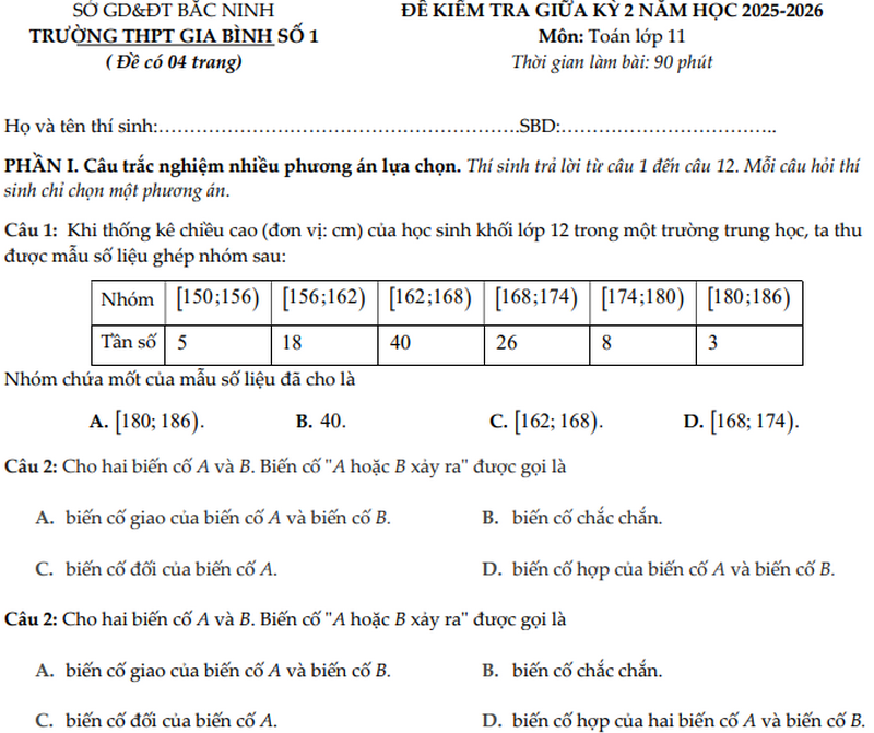 Đề giữa học kỳ 2 Toán 11 trường THPT Gia Bình 1 năm 2026