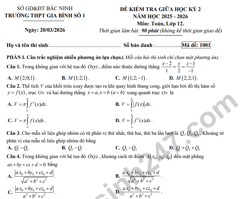 Đề giữa học kỳ 2 Toán 12 trường THPT Gia Bình 1 năm 2026