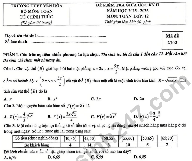 Đề giữa học kỳ 2 Toán 12 trường THPT Yên Hòa – Hà Nội năm 2026 Câu 1. Nhân dịp 8/3, các bạn trai lớp bạn Minh tự tay làm hộp quà để tặng các cô giáo của lớp. Mỗi hộp quà có dạng một hình chóp tứ giác đều S.ABCD (như hình dưới đây), các mặt bên và mặt đáy dán giấy bóng kính trong suốt, bên trong hộp quà sẽ gắn vật trang trí. Để làm khung cho hộp quà, cần dùng một đoạn dây thép dài 1,6 m và cắt thành ba đoạn: đoạn thứ nhất uốn thành viền của hình vuông đáy có cạnh bằng x (cm), hai đoạn còn lại có độ dài bằng nhau uốn thành các đường gấp khúc ASB và CSD (coi các mối nối là không đáng kể). Tìm x để phần không gian bên trong hộp quà có thể tích lớn nhất (kết quả làm tròn đến hàng phần chục).