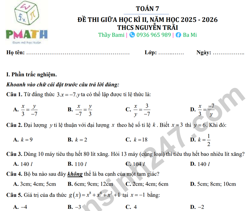 Đáp án Đề giữa học kỳ 2 Toán 7 trường THCS Nguyễn Trãi – Hà Nội năm 2026
