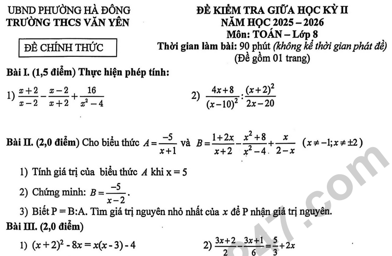Đề giữa học kỳ 2 Toán 8 trường THCS Văn Yên năm 2026