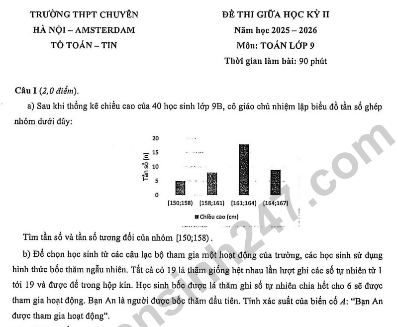 Đề giữa học kỳ 2 Toán 9 trường THPT chuyên Hà Nội – Amsterdam năm 2026 Câu II (1,5 điểm). Một người lái ô tô đi trên quãng đường dài 160 km. Sau khi đi được 100 km với vận tốc không đổi, ô tô tăng vận tốc thêm 15 km/h trên quãng đường còn lại. Biết thời gian ô tô đi hết toàn bộ quãng đường là 2 giờ. Tính vận tốc của ô tô lúc đầu.