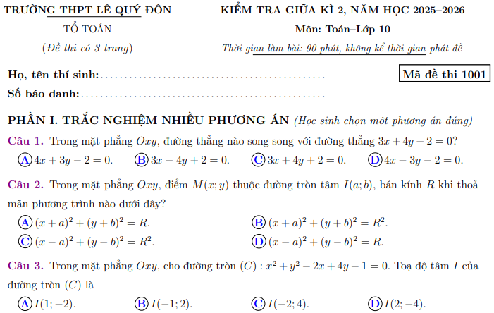 Đề giữa kì 2 Toán 10 trường THPT Lê Quý Đôn năm 2026 Câu 4. Trong mặt phẳng Oxy, có một nguồn âm phát ra từ điểm I. Biết rằng tại ba điểm A(1; 2), B(3; 4) và C(1; 0) nhận được âm thanh sau 2 giây kể từ khi nguồn âm phát ra. Hỏi sau bao nhiêu giây để điểm D(9; 4) nhận được âm thanh từ nguồn phát ra? (Biết vận tốc âm thanh truyền đi là một hằng số)