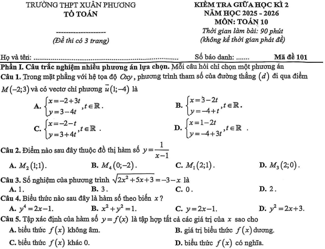 Đề giữa kì 2 Toán 10 trường THPT Xuân Phương năm 2026 Câu 3. Cổng của một ngôi trường có dạng một parabol. Để đo chiều cao h của cổng, một người đo khoảng cách giữa hai chân cổng được 10m; người đó thấy nếu đứng cách chân cổng 0,5m thì đầu chạm cổng. Cho biết người này cao 1,6m. Hãy tính chiều cao của cổng theo đơn vị mét (kết quả làm tròn đến hàng phần trăm).