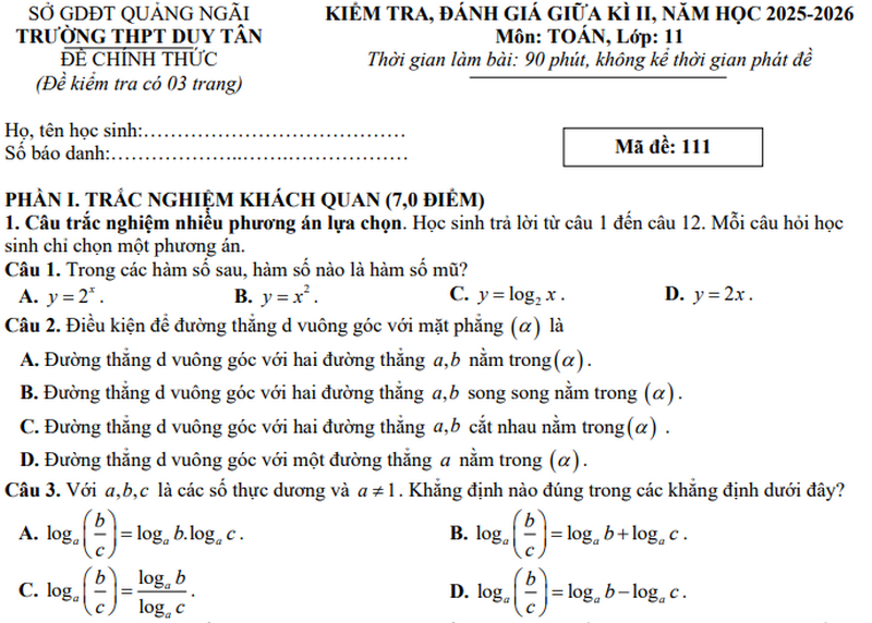 Đáp án Đề giữa kì 2 Toán 11 trường THPT Duy Tân năm 2026