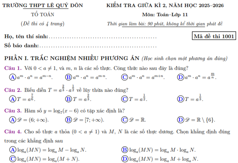 Đề giữa kì 2 Toán 11 trường THPT Lê Quý Đôn năm 2026