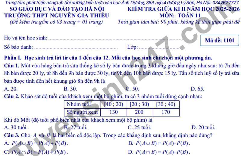 Đề giữa kì 2 Toán 11 trường THPT Nguyễn Gia Thiều năm 2026 Câu 1. Một cửa hàng bán trà sữa thống kê số ly bán được trong 3 khung giờ đầu ngày như sau: từ 7h đến 8h bán được 20 ly, từ 8h đến 9h bán được 30 ly, từ 9h đến 10h bán được 15 ly. Tần số tích luỹ số ly trà sữa bán được tính đến hết khung giờ 8h đến 9h là A. 20. B. 30. C. 50. D. 65.