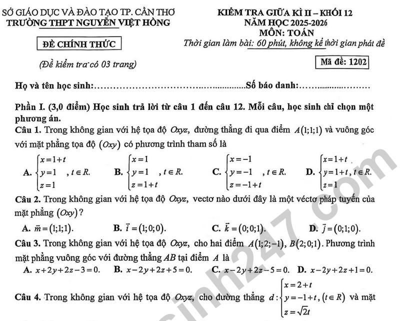 Đề giữa kì 2 Toán 12 trường THPT Nguyễn Việt Hồng năm 2026