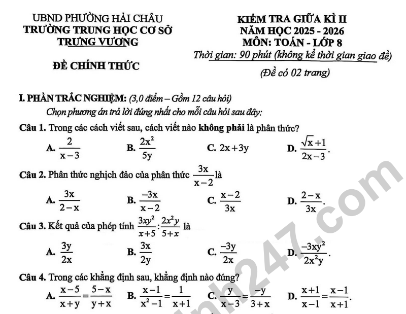 Đề giữa kì 2 Toán 8 trường THCS Trưng Vương năm 2026 Bài 3. (0,75 điểm) Một ô tô đi từ địa điểm A đến địa điểm B trên quãng đường dài 120 km. Trên nửa quấng đường đầu, ô tô chuyển động với vận tốc x (km/h). Trên nửa quãng đường còn lại, ô tô chuyển động với vận tốc lớn hơn vận tốc ban đầu 10 (km/h). a) Hãy viết biểu thức biểu thị thời gian ô tô đi hết quấng đường AB theo x. b) Tính thời gian ô tô đi hết qu ng đường AB khi x = 50.