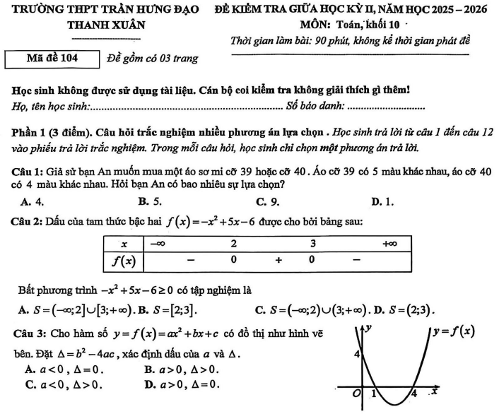 Đề giữa kỳ 2 Toán 10 trường THPT Trần Hưng Đạo năm 2026