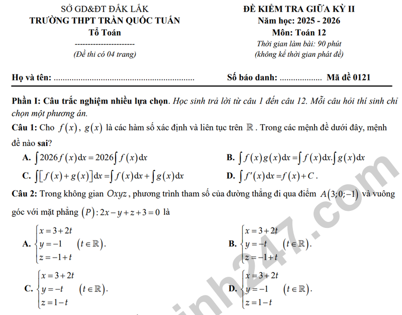 Đáp án Đề giữa kỳ 2 Toán 12 trường THPT Trần Quốc Tuấn năm 2026