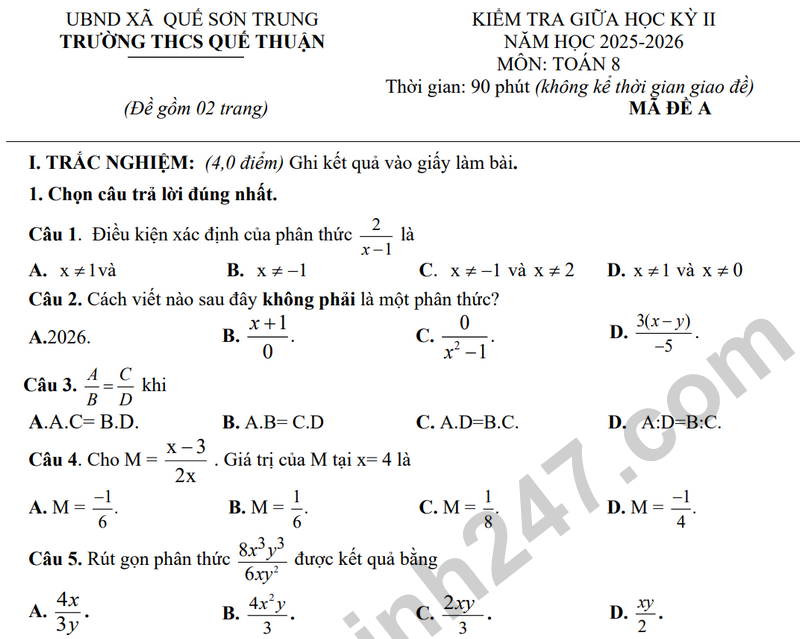 Đề giữa kỳ 2 Toán 8 trường THCS Quế Thuận năm 2026