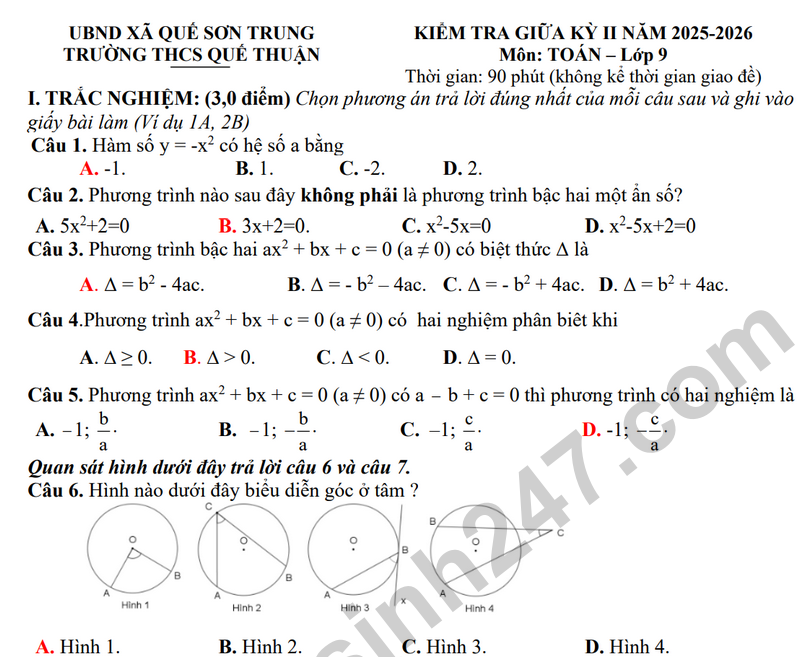 Đáp án Đề giữa kỳ 2 Toán 9 trường THCS Quế Thuận năm 2026