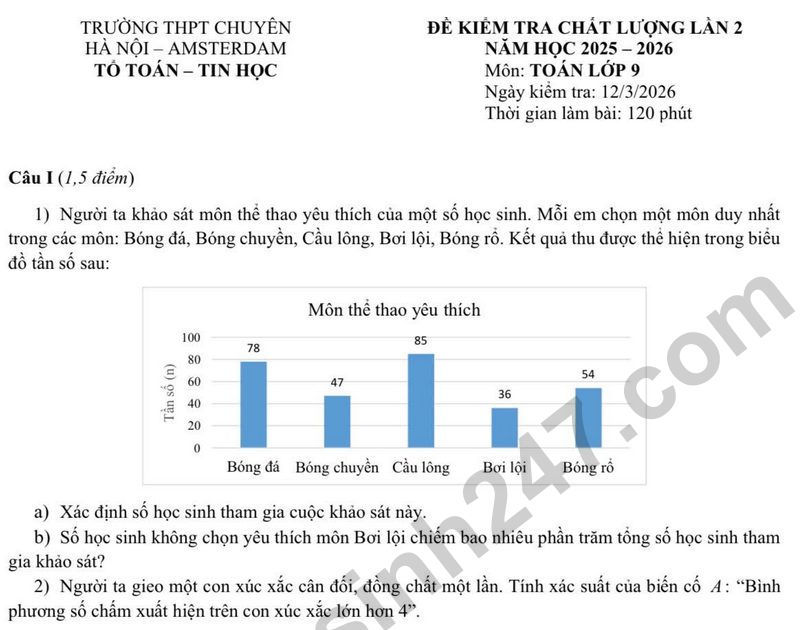 Đề khảo sát chất lượng lần 2 Toán 9 trường Chuyên Amsterdam năm 2026 Câu III (2,5 điểm) 1) Một xe khách đi từ Hà Nội về Hà Nam, quãng đường dài 60 km . Sau khi xe khách xuất phát được 50 phút, một xe máy bắt đầu đi từ Hà Nam lên Hà Nội và gặp xe khách sau đó 10 phút. Tính vận tốc của mỗi xe, biết rằng mỗi giờ xe khách đi nhanh hơn xe máy 18 km .
