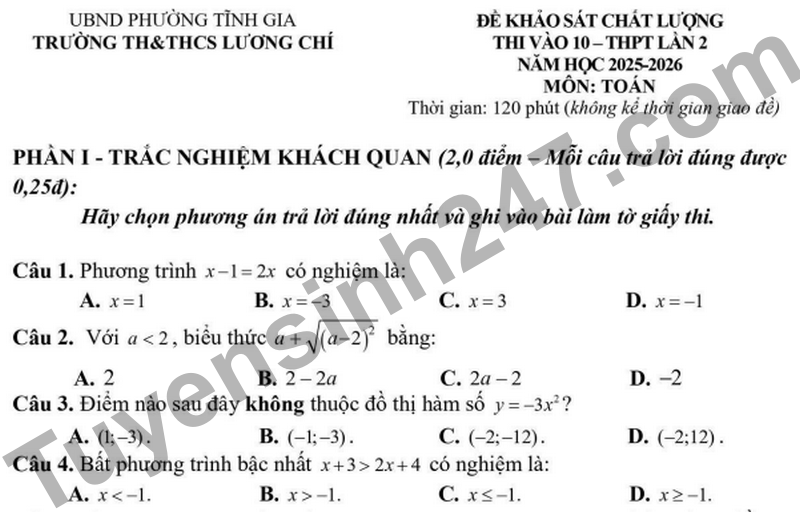 Đáp án Đề khảo sát chất lượng vào 10 lần 2 Trường TH&THCS Lương Chỉ năm 2026