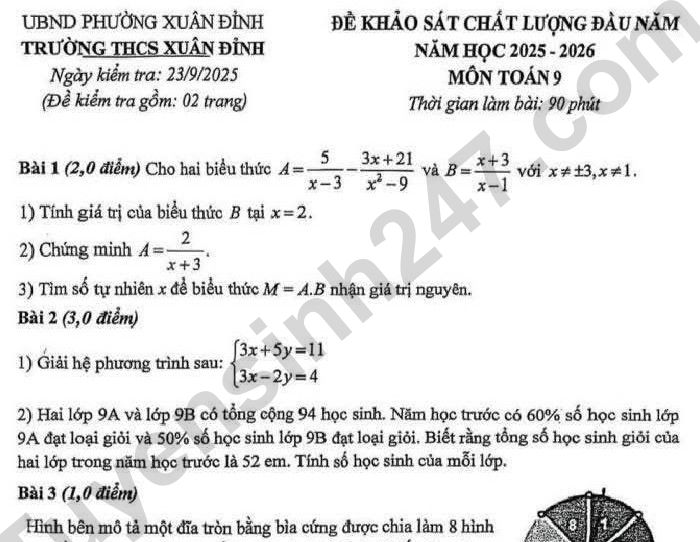 Đề khảo sát đầu năm lớp 9 môn Toán - THCS Xuân Đỉnh 2025 2) Hai lớp 9A và lớp 9B có tổng cộng 94 học sinh. Năm học trước có 60% số học sinh lớp Bài 3 (1,0 điểm) Hình bên mô tả một đĩa tròn bằng bìa cứng được chia làm 8 hình quạt bằng nhau và ghi các số 1; 2; 3; 4; 5; 6; 7; 8. Chiếc kim được gắn cố định vào trục quay ở tâm của đĩa. Quay đĩa tròn một lần. Tính xác suất của các biến cố sau: 1) Biến cố A: “Mũi tên chỉ vào hình quạt ghi số lớn hơn 3”. 2) Biến cố B: “Mũi tên chỉ vào hình quạt ghi số chẵn”. Theo TTHN DÀNH CHO 2K11 - LỘ TRÌNH ÔN THI VÀO LỚP 10 Tham khảo Khoá học lớp 9 - Lộ trình UP10 tại Tuyensinh247: Xem thêm thông tin và nhận tư vấn miễn phí - TẠI ĐÂY |