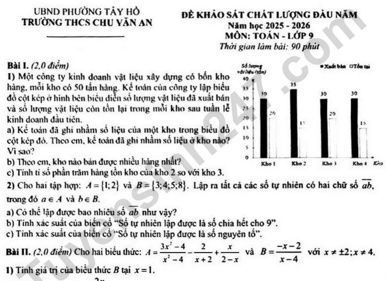 Đề khảo sát đầu năm môn Toán lớp 9 - THCS Chu Văn An 2025 1) Một công ty kinh doanh vật liệu xây dựng có bốn kho hàng, mỗi kho có 50 tấn hàng. Kế toán của công ty lập biểu đồ cột kép ở hình bên biểu diễn số lượng vật liệu đã xuất bán và số lượng vật liệu còn tồn lại trong mỗi kho sau tuần lễ kinh doanh đầu tiên. a) Kế toán đã ghi nhầm số liệu của một kho trong biểu đồ cột kép đó. Theo em, kế toán đã ghi nhầm số liệu ở kho nào? Vì sao? b) Theo em, kho nào bán được nhiều hàng nhất? c) Tinh tỉ số phần trăm hàng tồn kho của kho 2 so với kho 3. DÀNH CHO 2K11 - LỘ TRÌNH ÔN THI VÀO LỚP 10 Tham khảo Khoá học lớp 9 - Lộ trình UP10 tại Tuyensinh247: Xem thêm thông tin và nhận tư vấn miễn phí - TẠI ĐÂY |