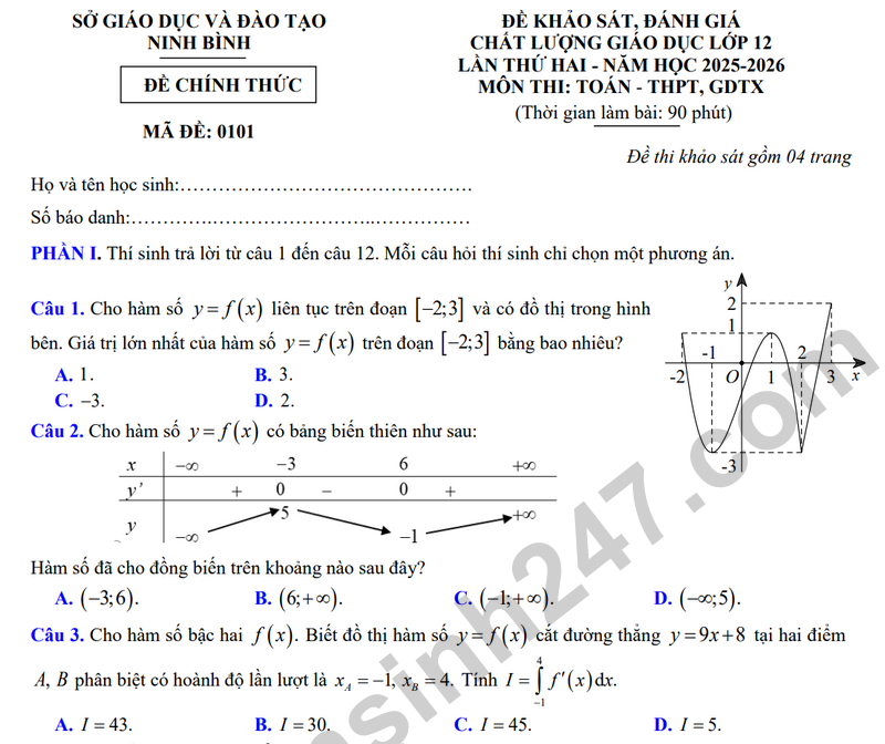 Đáp án Đề khảo sát Toán 12 lần 2 sở GD&ĐT Ninh Bình năm 2025 – 2026