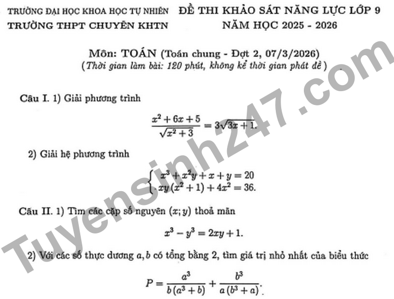 Đáp án Đề khảo sát Toán 9 Trường THPT Chuyên KHTN năm 2026