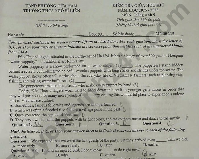 Đề kiểm tra giữa kì 1 môn Anh 9 THCS Ngô Sĩ Liên 2025 Mark the letter A, B, C, or D on your answer sheet to indicate the sentence that is closest in meaning to the original sentence in each of the following questions. Question 19. The city council wants to reduce construction noise by 20% in the next two years. A. The city council wants to put off construction noise by 20% in the next two years. B. The city council wants to cut off construction noise by 20% in the next two years. C. The city council wants to come down with construction noise by 20% in the next two years. D. The city council wants to cut down on construction noise by 20% in the next two years. Lưu ý: Đáp án trong đề là bài làm của học sinh, có thể không chính xác
