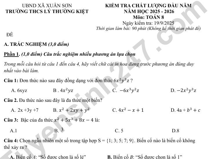 Đề KSCL đầu năm lớp 8 năm 2025 môn Toán - THCS Lý Thường Kiệt Câu 16 (0,5 điểm ): Một bình có 4 quả bóng có kích thước và khối lượng giống nhau , trong đó có 1 quả màu xanh, 1 quả màu vàng, 1 quả màu đỏ và 1 quả màu trắng. Lấy ra ngẫu nhiên 1 quả bóng từ bình a. Có mấy kết quả xảy ra ? b. Gọi A là biến cố “Lấy được quả màu đỏ” . Tính xác suất của biến cố A. Đáp án đề KSCL đầu năm lớp 8 năm 2025 môn Toán - THCS Lý Thường Kiệt Theo TTHN NẮM CHẮC KIẾN THỨC, BỨT PHÁ ĐIỂM 9,10 LỚP 1 - LỚP 12 CÙNG TUYENSINH247! Nếu em đang: