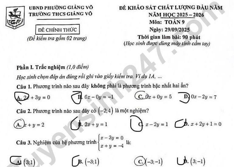 Đề KSCL đầu năm lớp 9 môn Toán 2025 - THCS Giảng Võ