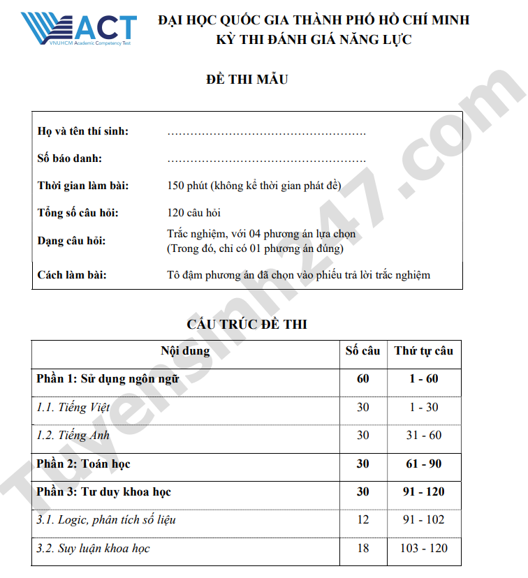 Kỳ thi ĐGNL ĐHQG-HCM được tổ chức theo hình thức thi trực tiếp trên giấy, với thời gian làm bài 150 phút. Đề thi ĐGNL Đại học Quốc gia TPHCM 2026 gồm 120 câu hỏi trắc nghiệm khách quan, mỗi câu có 04 phương án lựa chọn (A, B, C, D); thí sinh chọn 01 phương án đúng duy nhất cho mỗi câu hỏi. Cấu trúc đề thi: Phần 1. Sử dụng ngôn ngữ (60 câu): o Tiếng Việt: 30 câu; o Tiếng Anh: 30 câu. Phần 2. Toán học (30 câu). Phần 3. Tư duy khoa học (30 câu): Logic, phân tích số liệu: 12 câu; Suy luận khoa học: 18 câu. >> Xem thêm: Lịch thi Đánh giá năng lực HCM 2026 TẠI ĐÂY >> TẢI ĐỀ MINH HỌA ĐGNL HCM 2026 TẠI ĐÂY Đề minh họa Đánh giá năng lực HCM năm 2026