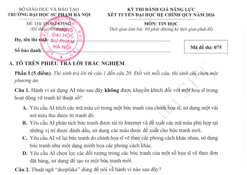 Đáp án đề thi minh họa ĐGNL ĐHSPHN 2026 môn Tin