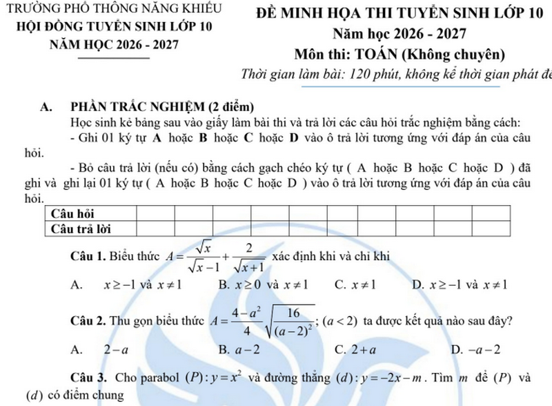 Đáp án Đề minh họa thi tuyển sinh vào 10 Trường PTNK năm 2026